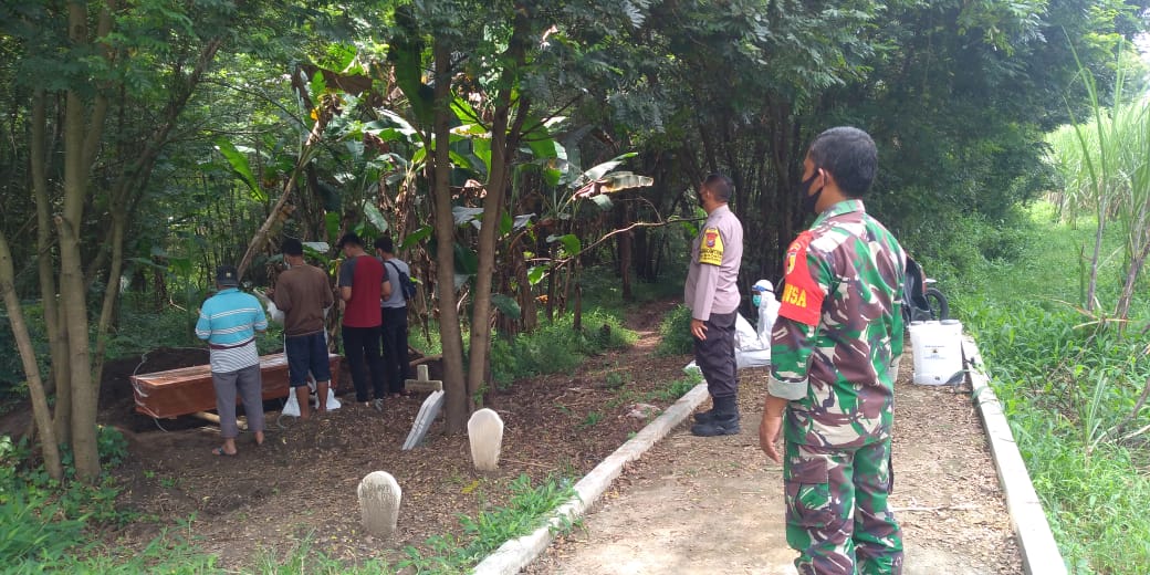 Maospati.Babinsa Koramil Tipe B 0804/06 Maospati Serda Suroto bersama Babinkamtibmas Polsek Maospati melaksanakan kegiatan pengamanan pemakaman warga yang terindikasi Covid 19 secara protokol kesehatan Covid 19 di pemakaman umum Kelurahan Maospati Kec.Maospati Kab. Magetan.Rabo (3/03/2021)