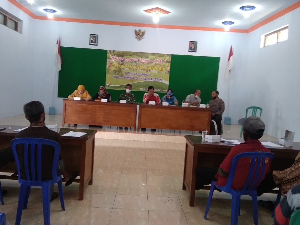 Komandan Posramil Ngariboyo Kodim 0804 Magetan Peltu Hadi Kusnomo bersama Forkopimca Ngariboyo menghadiri kegiatan Rapat Anggota Tahunan (RAT) GAPOKTAN KARYA MANDIRI Desa Banjarjo Tahun 2020.bertempat di Balai Desa Banjarjo Kecamatan Ngariboyo Kabupaten