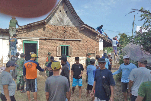Magetan. Anggota Koramil Tipe B 0804/11 Takeran bersama masyarakat Desa Driyorejo, Dsn Pagaran, Rt. 02/01 Kecamatan Nguntoronadi, Kabupaten Magetan, melaksanakan karya bakti menurunkan genting/atap rumah yang rencana akan di rehab milik Bapak Gondo. Senin(22/03/2021)