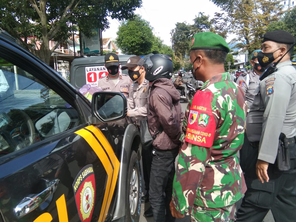 Patroli Gabungan Koramil Tipe B 0804/01 Magetan dan Polsekta Magetan di wilayah kecamatan Magetan tetap melaksanakan penegakan disiplin Prokes Covid 19, dengan membuat skema operasi yustisi covid-19 dilakukan secara rutin dan terus-menerus adalah salah satu upayanya untuk mencegah penyebaran agar tidak meluas.