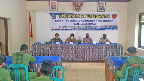 Dalam kesempatan ini Danramil Tipe B 0804/10 Kawedanan Kapten Inf Sarpan memberikan materi Wawasan Kebangsaan terhadap para Linmas Desa Karangrejo yang intinya sebagai berikut, Pembinaan potensi rakyat untuk kepentingan Hankam bertujuan untuk mengikut sertakan rakyat secara tertib dan teratur dalam Pertahanan Keamanan Nasional, sehingga terwujud satuan bentuk Pertahanan Keamanan Nasional yang berlandaskan potensi rakyat semesta, lalu menghimpun potensi rakyat dalam pertahanan sipil dan perlawanan keamanan rakyat semesta memberikan latihan-latihan keterampilan yang bersangkutan dengan tugas kewajiban dan persiapan sebagai komponen cadangan.