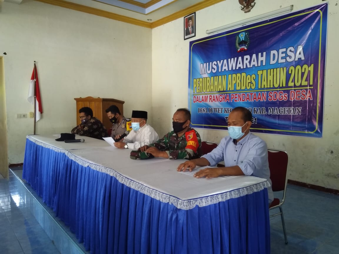 Magetan. Babinsa Desa Duwet Koramil Tipe B 0804/13 Bendo Sertu Rudi Hartono menghadiri Musyawarah Desa Penetapan Perubahan Anggaran Pendapatan dan Belanja Desa (APBDes) Tahun Anggaran 2021 Desa Duwet di Balaidesa Duwet Kecamatan Bendo Kabupaten Magetan. (Minggu,02/05/2021)