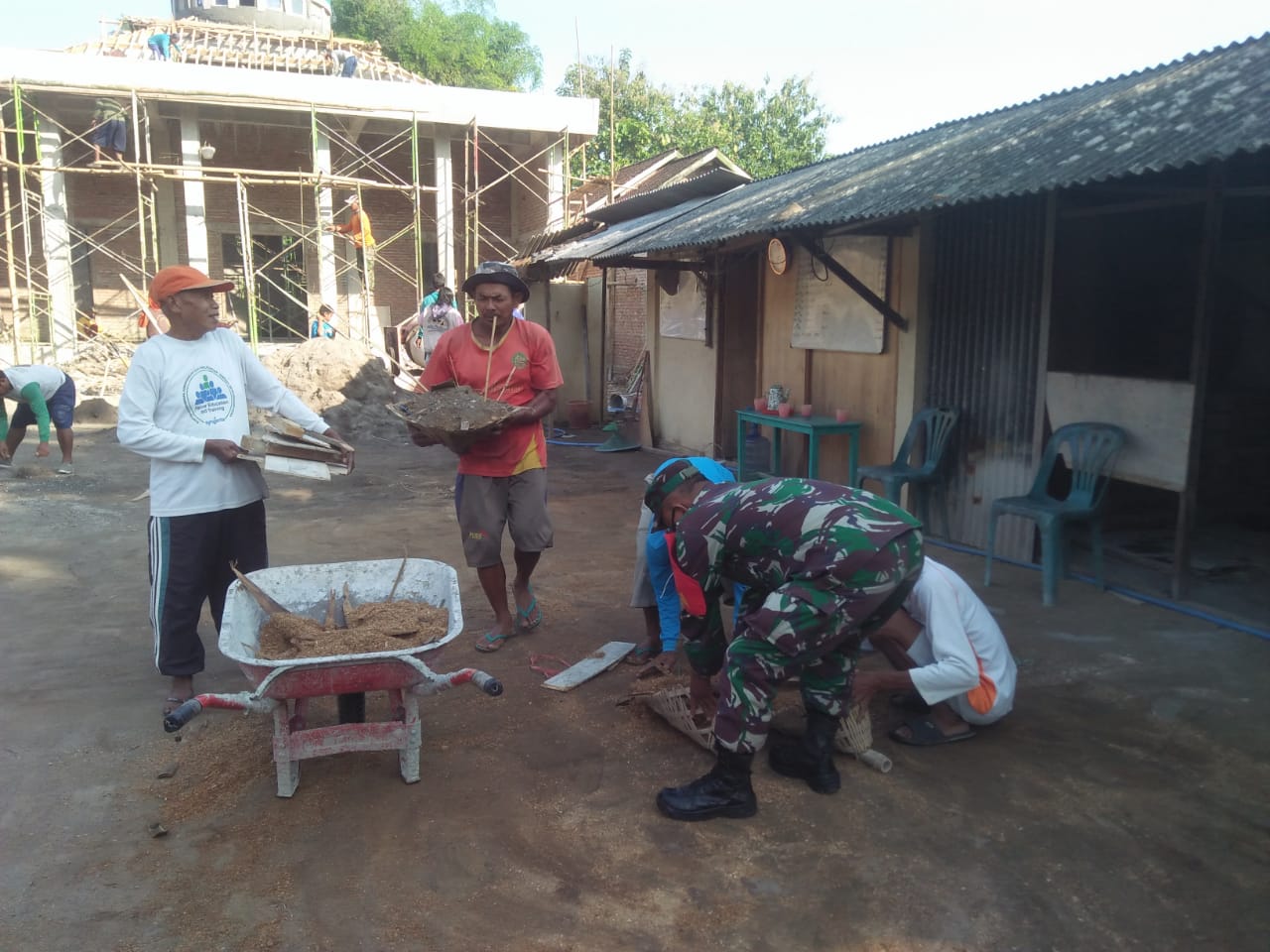 Nampak puluhan warga dibantu Babinsa meratakan halaman masjid yang saat ini masih tahap perehaban yang belum selesai dan juga membersihkan sampah-sampah di lingkungan sekitar masjid tersebut kemudian dibuang ke tempat pembakaran sampah.