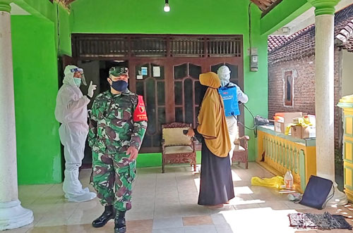 Magetan – Babinsa Koramil Tipe B 0804/07 Karangrejo monitoring sterilisasi penyemprotan disinfektan di wilayah binaanya. Salah satunya Serda Tri susilo Babinsa yang turut mendampingi tim penyemprotan di lingkungan warga binaannya yang terdampak Covid-19.