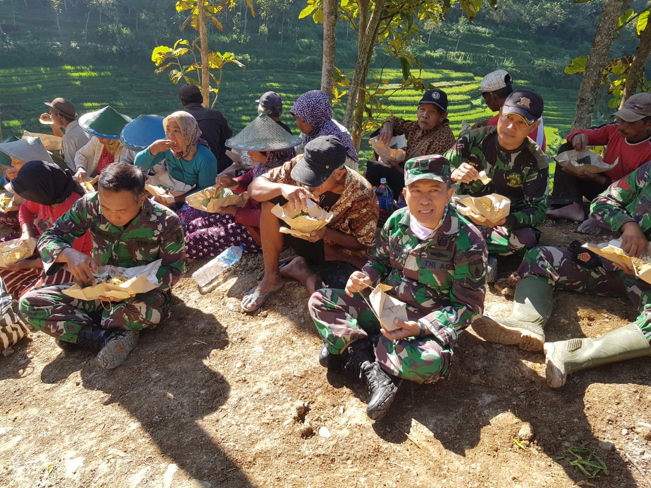 Magetan. Usai mengumpulkan material pembangunan jalan baru, aggota Satuan Tugas (Satgas) TNI Manunggal Membangun Desa (TMMD) Reguler ke-111 Kodim 0804/Magetan istirahat di bawah pohon. Mereka duduk bersama sambil menikmati angin yang sepoi-sepoi. Tidak hanya itu, anggota Satgas TNI Manunggal membangun desa TMMD juga berkumpul sambil menikmati makanan khas pedesaan rebusan telo rambat yang dibawakan oleh Read More