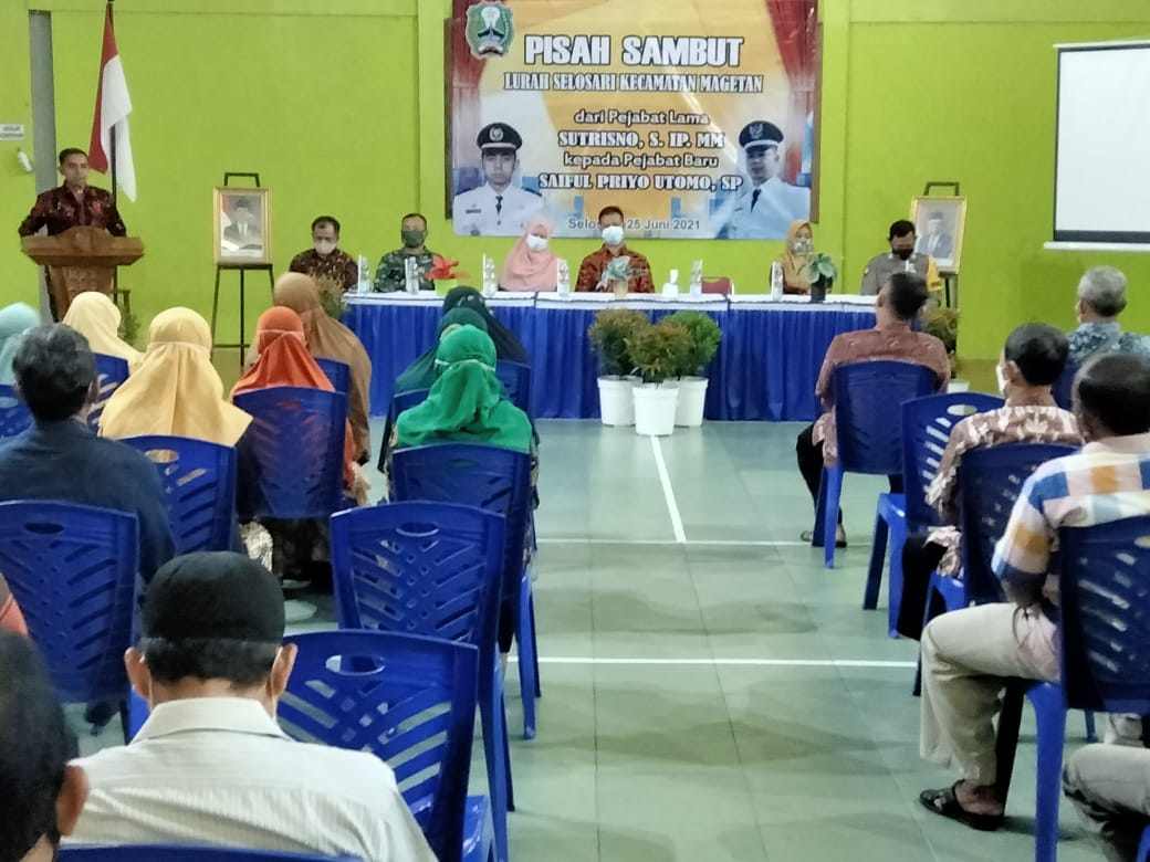 Babinsa Kelurahan Selosari Koramil Tipe B 0804/01 Magetan Kodim 0804 Magetan Pelda Samsul Arifin menghadiri pelaksanaan kegiatan pisah sambut Kepala Kelurahan Selosari baru Bapak Saiful Priyo Utomo, SP dengan Kepala Kelurahan Selosari lama Bapak Sutrisno, S.IP MM di Aula Kelurahan Selosari Kecamatan Magetan Kabupaten Magetan.