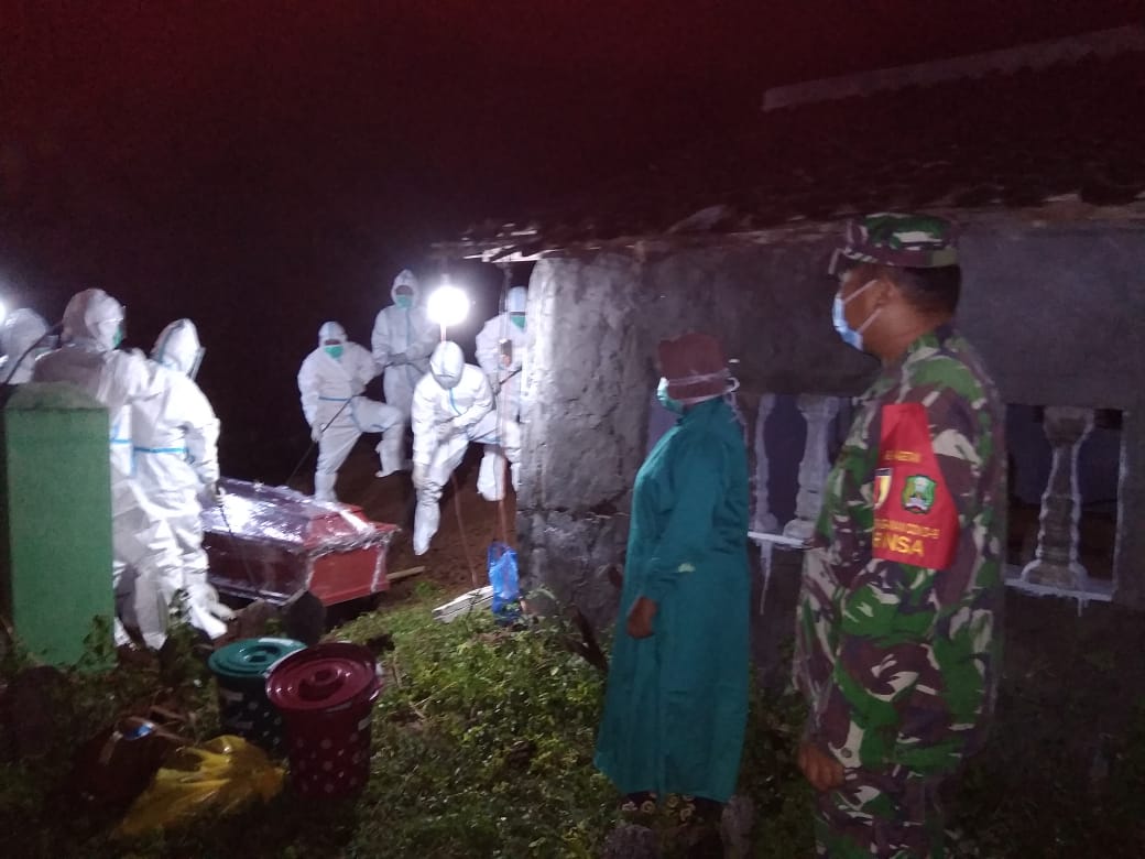 Setelah mendapatkan informasi bahwa adanya warga meninggal dunia terkonfirm Covid 19, Babinsa langsung berkoordinasi terkait pemakaman secara protokol kesehatan dengan tiga pilar dan petugas kesehatan dan menyakinkan tidak ada penolakan dari warga setempat.
