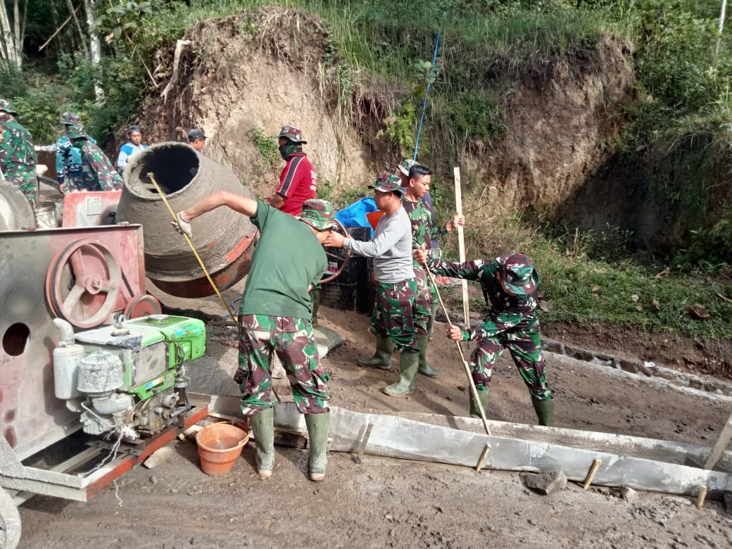 Suara molen terus berputar mengiringi semangat TNI yang tak pernah mengenal rapuh, terus bersama warga melanjutkan pekerjaan pengecoran jalan.