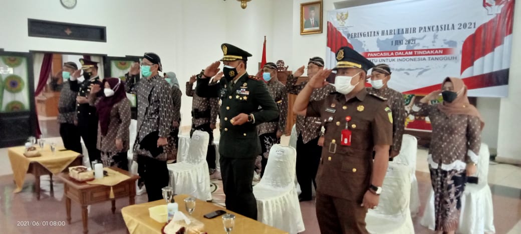 Magetan. Mengingat saat ini masih dalam situasi dan kondisi pandemi COVID-19 yang mengharuskan kita menjaga jarak dan mematuhi protokol kesehatan, maka upacara peringatan hari lahirnya pancasila di Kab. Magetan kali ini diselenggarakan secara virtual di Ruang Jamuan Pendopo Surya Graha Magetan. Selasa (1/06/2021)