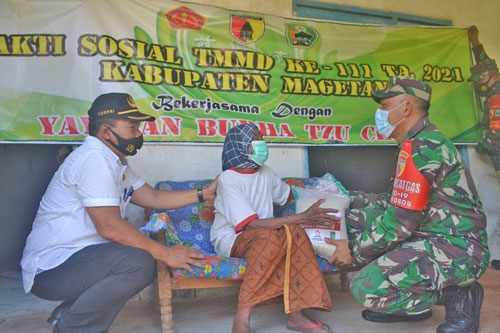 Meningkatkan kepedulian terhadap warga, Danramil Tipe B 0804/01 Magetan mendampingi Komandan Kodim 0804 Magetan memberikan bantuan sembako bagi warga yang kurang mampu.