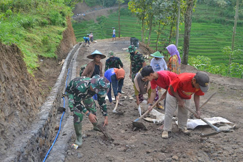 Magetan – Warga Dusun Templek Ds. Gonggang Kecamatan Poncol Kabupaten Magetan bersama dengan anggota satgas TMMD saling bahu membahu dan bergotong royong dalam melaksanakan pembangunan di TMMD ke-111 di desanya.