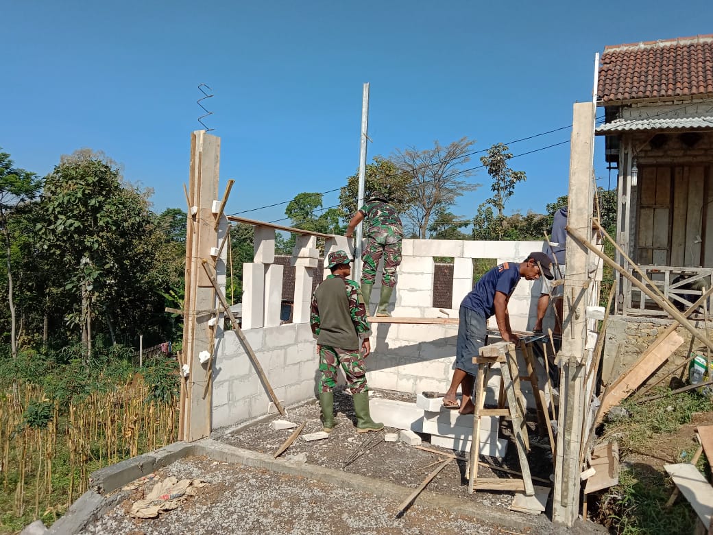 Magetan. Satuan Tugas (Satgas) TMMD ke-111 Kodim 0804/Magetan dan warga bekerja bersama melanjutkan pembangunan poskamling di lokasi TMMD Dusun Templek Kecamatan Poncol Kabupaten Magetan, yang pembangunannya telah memasuki tahap pemasangan bata ringan untuk dinding. Minggu (27/6/2021)