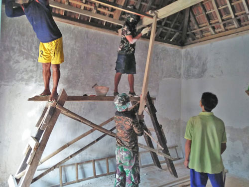 Magetan. Progres perbaikan Mushola Baitussalam di Dusun Templek, Desa Gonggang menunjukkan perkembangan signifikan. Alhasil, memasuki hari ke 9 Program Tentara Manunggal Membangun Desa (TMMD) ke 111 Kodim 0804/Magetan perbaikan mushola itu kini telah memasuki pemasangan rangka plafon atap mushola. Untuk itu, personel satgas berencana merampungkan seluruh pemasangan rangka sekaligus plafon musholla. Rabu(23/06/2021)