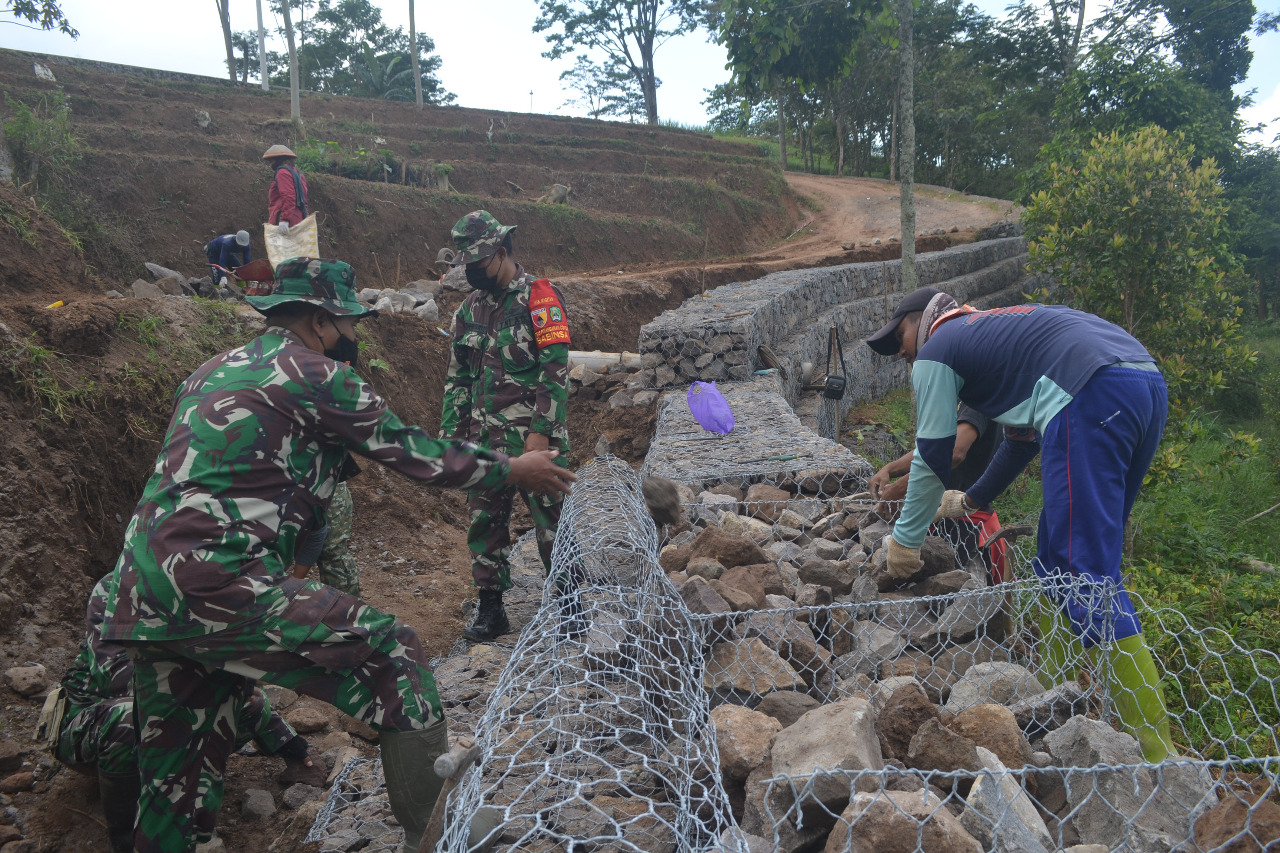 Baik personil TNI maupun masyarakat dilokasi pra TMMD di Desa Gonggang, Kec. Poncol, Kab. Magetan. terus beraksi berjibaku mengerjakan sasaran fisik, mulai dari pebuatan talud, pelebaran jalan dan pemasangan batu bronjong, Senin (07/06/2021).
