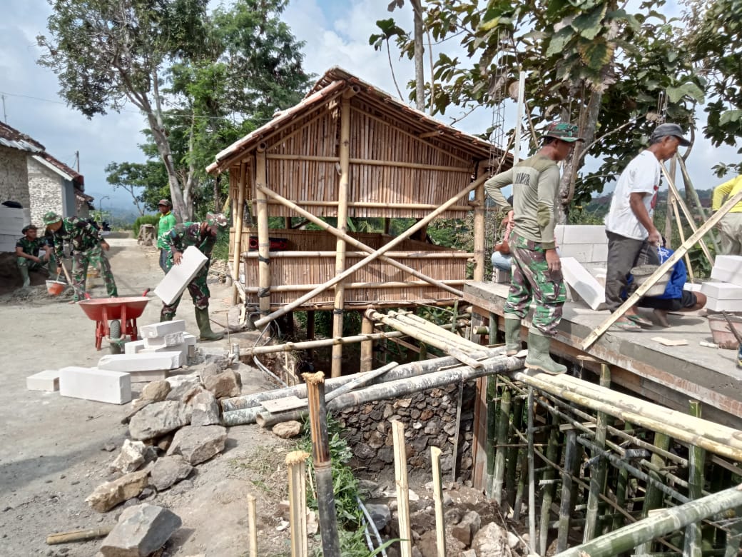 Magetan. Cuaca di Dusun Templek Desa Gonggang Kecamatan Poncol Kabupaten Magetan cukup cerah. Meski begitu terik matahari cukup menyengat, namun warga bersama dengan anggota Satgas TMMD Kodim 0804/Magetan masih semangat mendirikan poskamling.