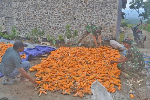 Satgas TMMD Kodim 0804/Magetan tak segan-segan membantu warga setempat dalam menjemur jagung. Tak jarang suasana gotong royong antara TNI dan warga sangat tercermin dalam pelaksanaan TMMD 111 di Desa Gonggang.