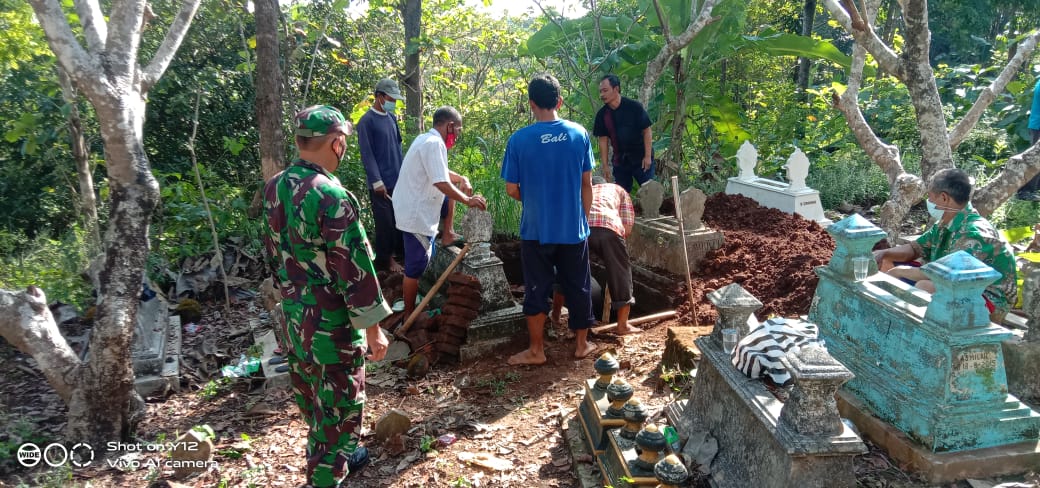 Magetan. Babinsa Desa Selopanggung Posramil Ngariboyo Kodim 0804 Magetan Serda Edy Wiratno melaksanakan pengamanan pemakaman jenazah salah satu warga Desa binaan yang Meninggal Dunia terkonfirmasi positif Covid 19 di TPU Dukuh RT 06/RW 01 Desa Selopanggung Kecamatan Ngariboyo Kabupaten Magetan. Selasa (06/07/2021)