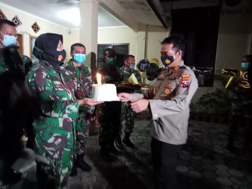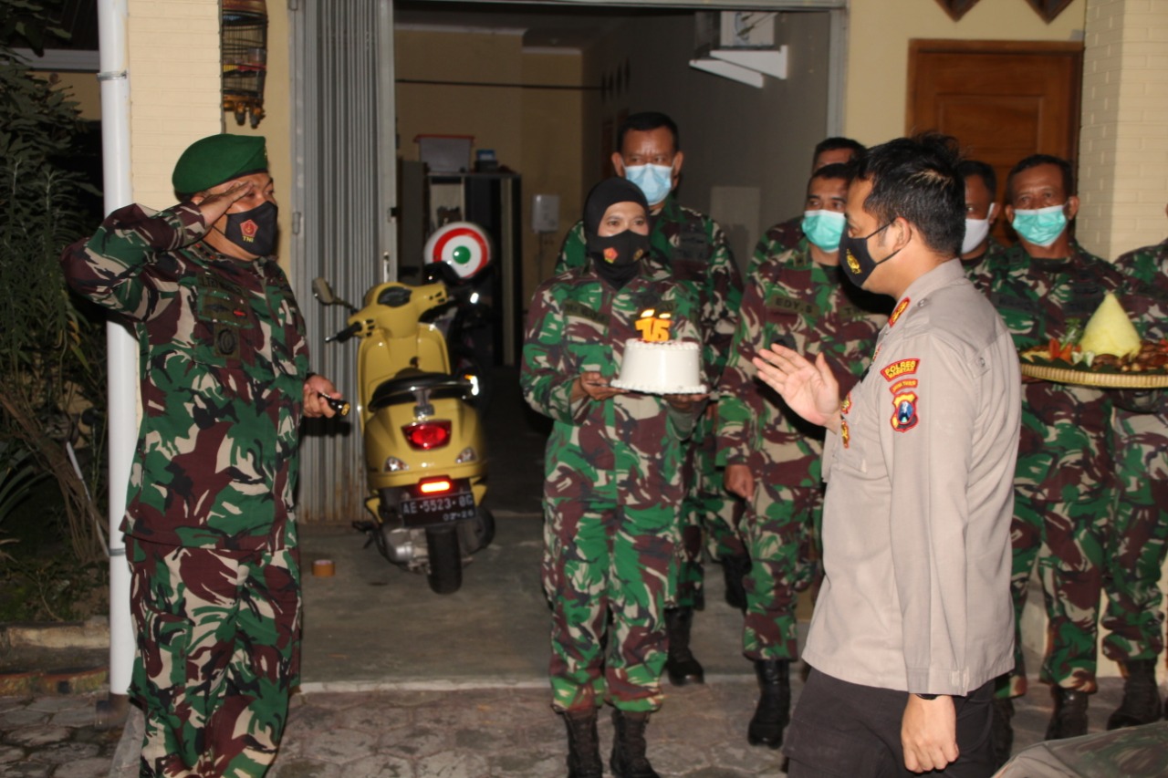 Didampingi Kasdim, Perwira staf Kodim, Dandim 0804/Magetan Letkol Inf Ismulyono Tri Widodo S.I.P mendatangi Kapolres Magetan di kediaman (rumah dinas) Jln Inspol Ismiadi dengan suasana sederhana, sambil membawa kue tart berhias lilin dan bertemakan HUT Bhayangkara ke-75. Tentu saja dengan tak lupa menyanyikan lagu “Selamat Ulang Tahun”, membuat kapolres terharu dan bangga.