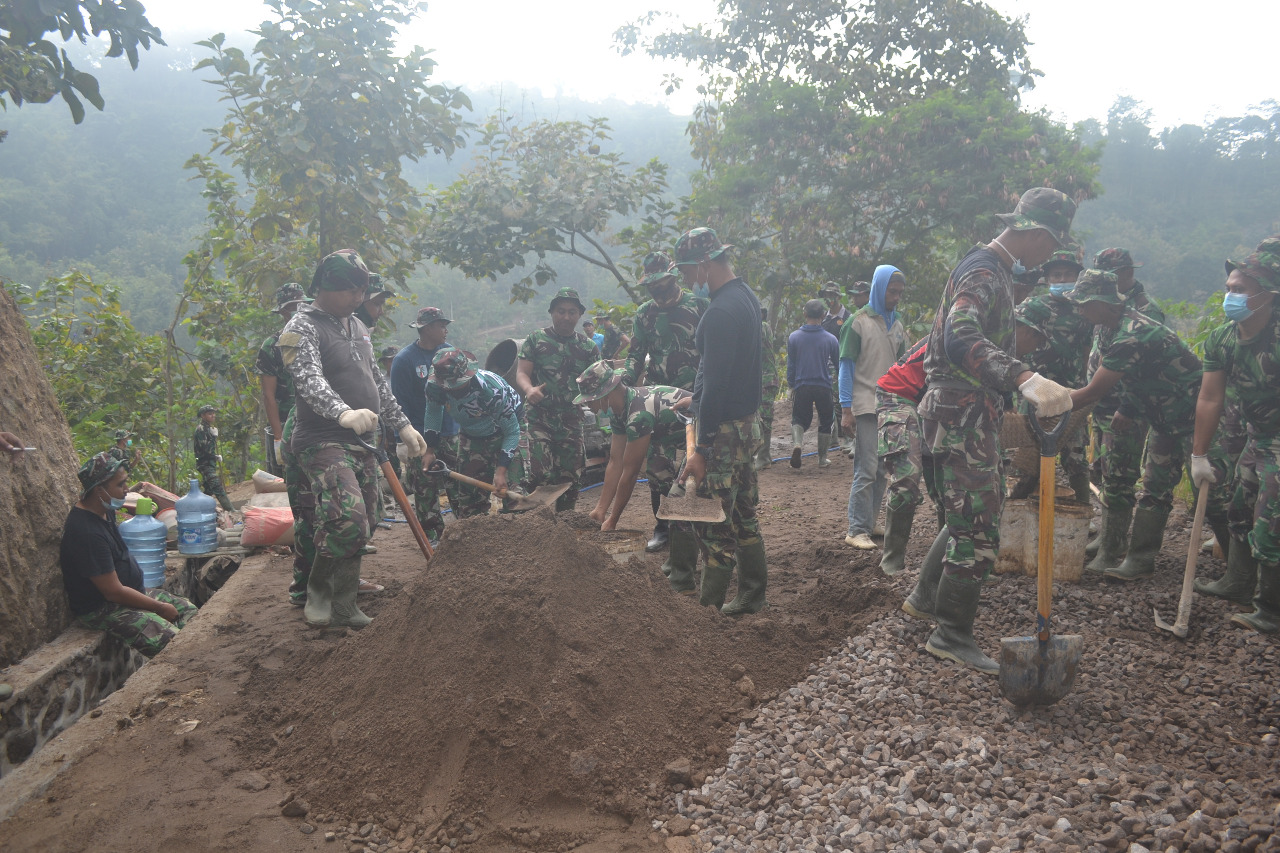 Magetan | Satgas TMMD Reguler 111 Kodim 0804/Magetan bersama warga Dusun Templek, kembali bergotong-royong, melanjutkan Pengecoran Jalan Sepanjang 1550 meter di Desa Gonggang Dusun Templek Kecamatan Poncol Kabupaten Magetan untuk menguber target, Kamis (08/07/2021).