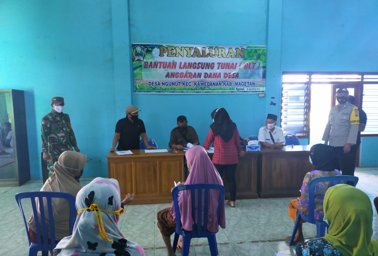 Magetan – Babinsa Koramil Tipe B 0804/10 Kawedanan Serda Tarmidi bersama Bhabinkamtibmas dari Polsek Kawedanan, melaksanakan pengawalan dan pengamanan dalam kegiatan penyaluran Bantuan Langsung Tunai (BLT) yang bertempat di Balai Desa Ngunut Kecamatan Kawedanan pada Hari Rabu (25/08/2021).