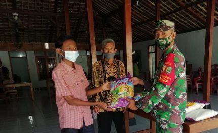 Terlihat Babinsa desa Kuwon Sertu Supriyadi menyalurkan bantuan Sembako berupa beras dari Kodim 0804/Magetan kepada warga binaannya yang terkena dampak PPKM Level IV.