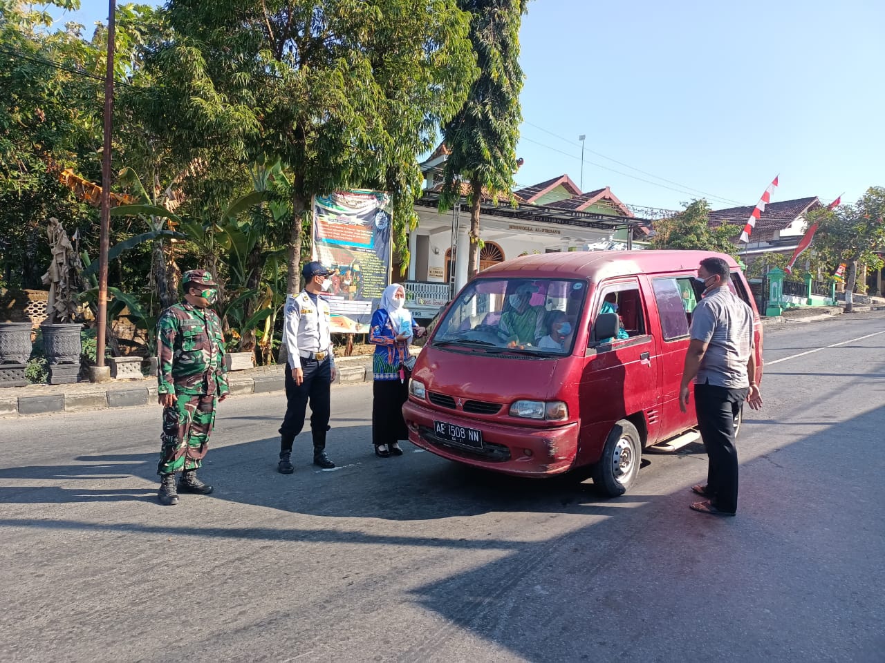 Magetan. Anggota Koramil Tipe B 0894/04 Parang, Sertu M Lutfi bersama pengusrus Badan Kontak Majlis Taklim (BKMT) Magetan dan ibu – ibu PKK melaksanakan pembagian Masker dan Vitamin C untuk penguna jalan di perempatan lampu merah Parang Kecamatan Parang Kabupaten Magetan. Selasa (17/08/2021)