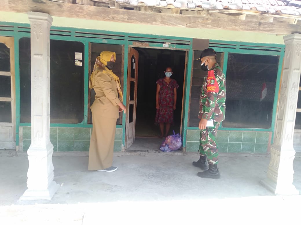 Magetan. Wujud perhatian dan kepedulian Beri dukungan dan semangat moril Babinsa Koramil Tipe B 0804/12 Lembeyan Sertu Sumadi bersama aparat pemerintah desa kediren Berikan sembako kepada Warga terdampak pandemi Covid 19 di desa Kediren Kecamatan lembeyan kabpaten magetan Sabtu 28/9/2020