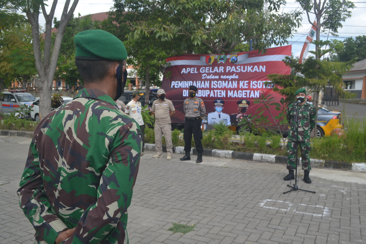 Dalam apel gelar pasukan gabungan pemindahan dari isolasi mandiri (Isoman) ke isolasi terpusat (isoter) tersebut Kasdim 0804 didampingi oleh Sekda Kab Magetan Ir.Hergunadi MT, Asisten I pemerintah dan kesra Sekdakab Magetan Drs. Venly Tomy Nicolas, SH. MM, Kepala BPBD Magetan Arie Budi. Perwakilan Polres Magetan Ipda Taufiq, Kadishub Magetan Wely Sumasam, Kasat Pol PP Magetan Rudi serta dihadiri oleh Satgas Covid-19, personil gabungan dari TNI Polri, BPBD Magetan, Dinas Kesehatan Magetan, Satpol PP dan Dishub Magetan.