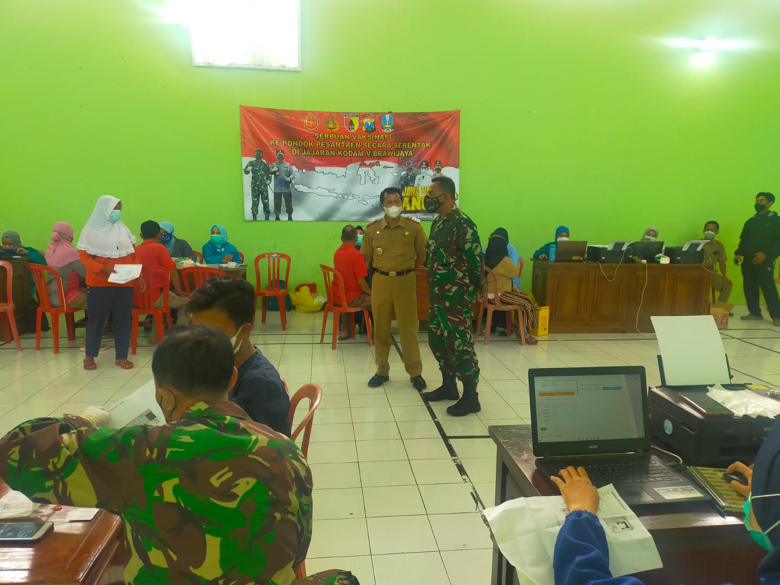 Magetan – Guna mendukung percepatan program vaksinasi, Koramil Tipe B 0804/02 Plaosan bersama Puskesmas Sidokerto menggelar serbuan vaksinasi dosis pertama kepada santri dan takmir masjid dan warga desa Widorokandang di aula desa Widorokandang,Kabupaten Magetan.Senin, (30/8/2021).
