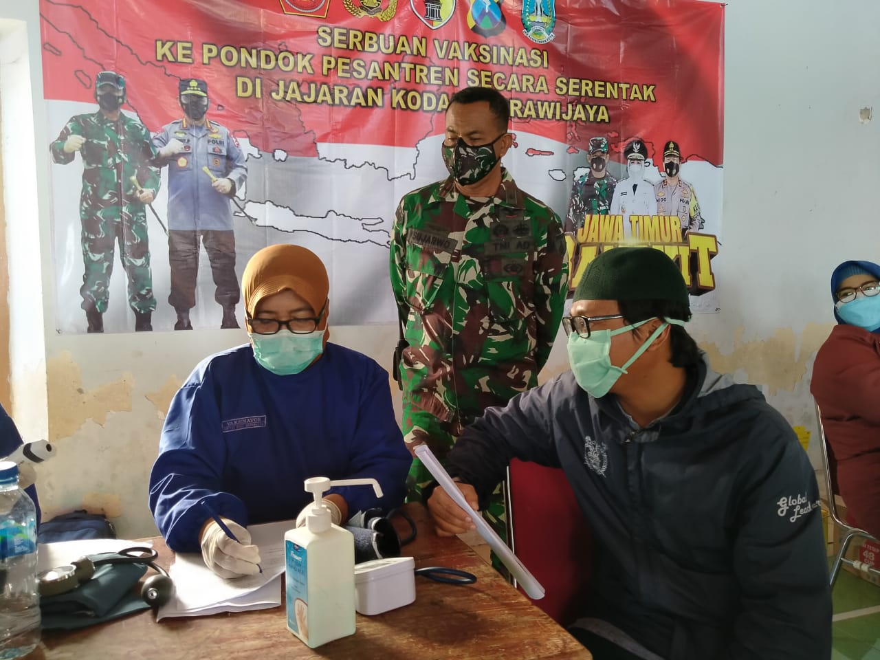 Magetan – Guna mendukung percepatan program vaksinasi, Koramil Tipe B 0804/02 Plaosan.bersama Puskesmas Sidorejo menggelar serbuan vaksinasi dosis pertama kepada santri pondok pesantren Ma’had ittiiba us Sunnah dan warga desa Sidorejo di aula desa Sidorejo.Kamis, (26/8/2021).