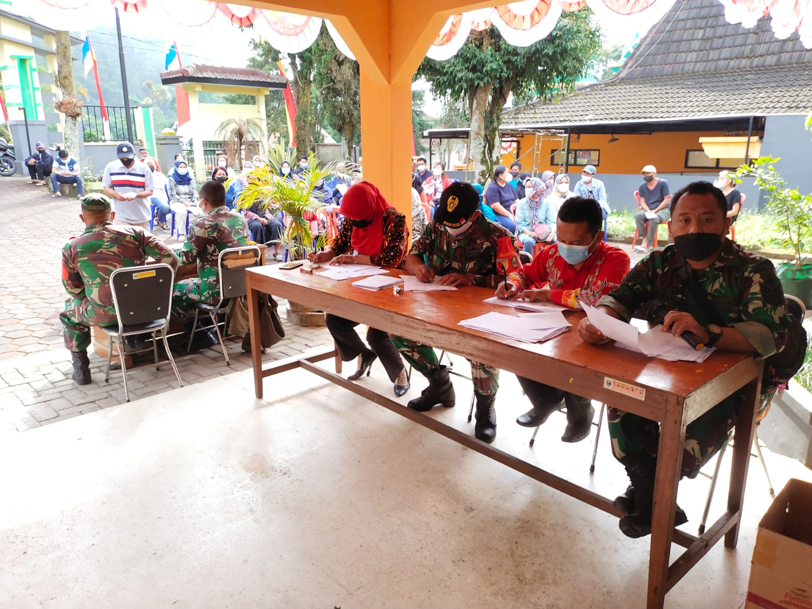Magetan – Guna mendukung percepatan program vaksinasi, Koramil Tipe B 0804/02 Plaosan.bersama Puskesmas Plaosan menggelar serbuan vaksinasi dosis kedua bagi warga kelurahan sarangan di kantor kelurahan sarangan. Kamis, (19/8/2021).