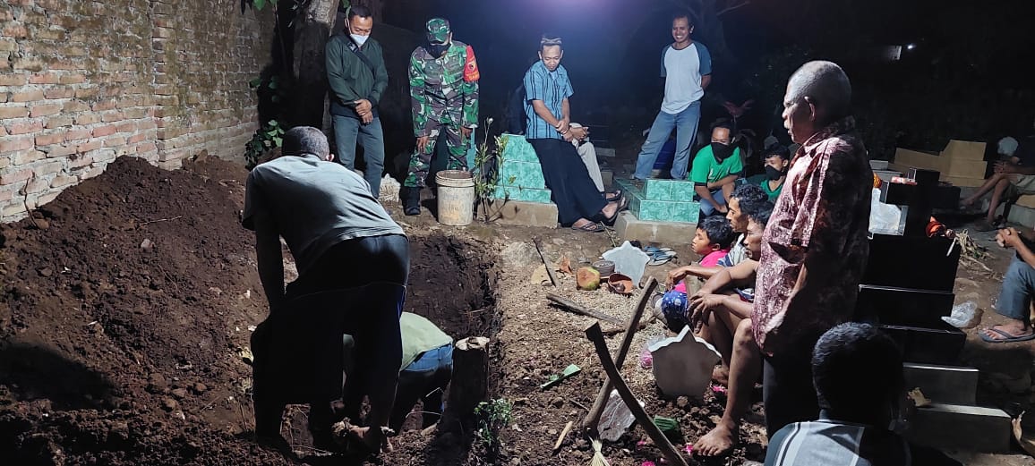 Magetan – Babinsa Kelurahan Tawanganom Koramil Tipe B 0804/01 Magetan Kodim 0804 Magetan Sertu Ponijan bersama Tiga Pilar Kelurahan Tawanganom mengamankan pemakaman warga binaannya yang meninggal dunia karena suspek Covid 19 dengan penyakit penyerta asam lambung atas nama Alm Koko Suwoso usia 75 tahun dan dimakamkan di TPU Asem Lawe pedukuhan Nanom Kelurahan Tawanganom Kecamatan Magetan Kabupaten Magetan. Minggu malam (27/09/2021)