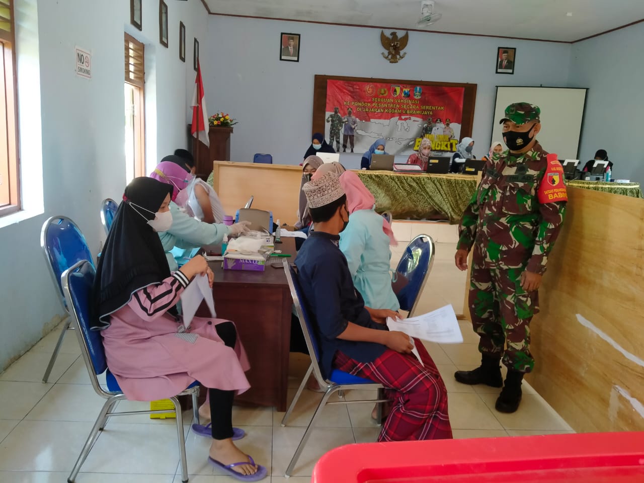 Terkait hadirnya Babinsa dan Babinkamtibmas Danramil Tipe B 0804/09 Sukomoro menyampaikan bahwa dalam pelaksanaan kegiatan Vaksinasi, kehadiran aparat keamanan disini untuk memastikan kelancaran dan ketertiban pelaksanaan Vaksinasi.