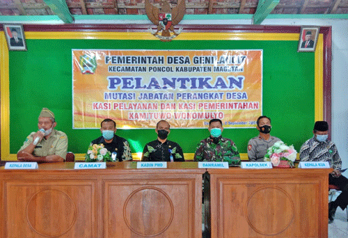 Magetan . Danramil Tipe B 0804/05 poncol Kapten Inf Joko priyadi dengan didampingi Babinsa Desa geni langit sertu marjuki menghadiri undangan pelantikan mutasi jabatan dan pengambilan sumpah jabatan Perangkat Desa genilangit Pelantikan dilakukan oleh Kepala Desa (Kades) bapak supardi untuk pejabat baru Kepala Dusun (Kadus) dan Kasi Pelayanan desa genilangit Kec poncol, Kab magetan. Kamis (02/09/2021).