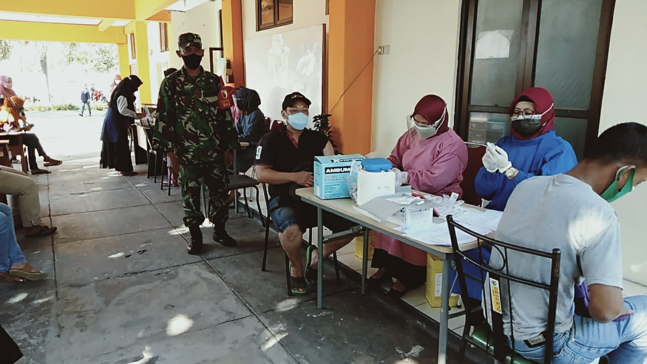 Magetan – Anggota Koramil Tipe B 0804/07 Karangrejo Serda Purwanto melaksanakan pendampingan dan pantau protokol kesehatan dalam kegiatan Vaksin Covid-19 (Moderna) yang dilaksanakan di UPTD Puskesmas Karangrejo Kec. Karangrejo Kabupaten Magetan, Jumat (03/09/2021).