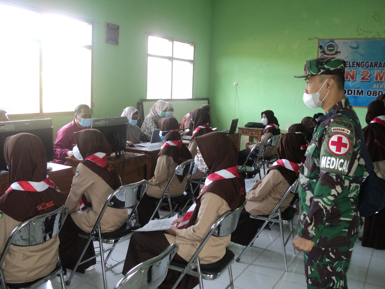 Sebanyak lebih kurang 275 pelajar MAN 2 Magetan turut menjalani vaksinasi yang digelar oleh Kodim 0804/Magetan di Aula Sekolah setempat dengan tetap menerapkan protokol kesehatan ketat. Serbuan vaksinasi tersebut melibatkan puluhan vaksinator dari Tenaga Kesehatan (Nakes) Poskes Magetan. Jum’at (3/9/2021)