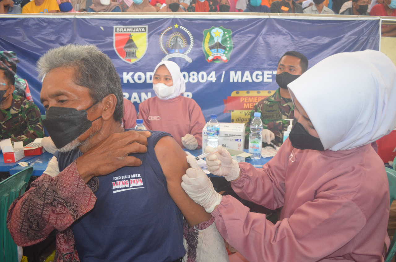 Magetan. Dalam rangka mendukung program pemerintah untuk mempercepat herd imunity masyarakat, Pemkab. Magetan berkolaborasi dengan Kodim 0804/Magetan dan Polres Magetan mengelar vaksinasi serentak.
