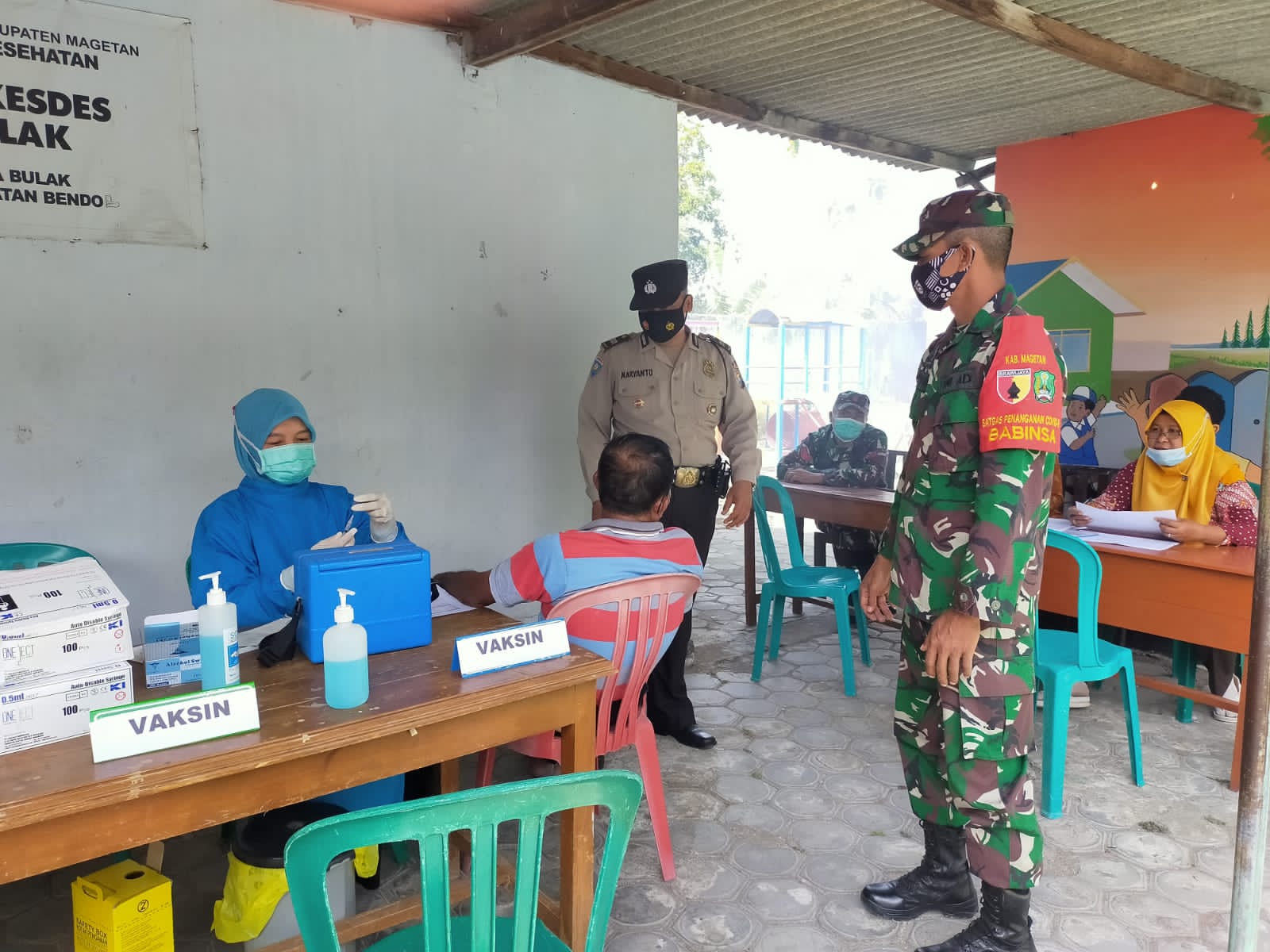 Magetan. Bertempat di Balaidesa Bulak Kecamatan Bendo Kabupaten Magetan, Puskesmas Bendo didampingi Koramil Tipe B 0804/13 Bendo, Polsek Bendo gelar vaksinasi Covid 19 dosis ke 1 jenis Sinovac dengan sasaran 500 orang diutamakan bagi para Lansia di wilayah desa Bulak. Rabu (06/10/2021)