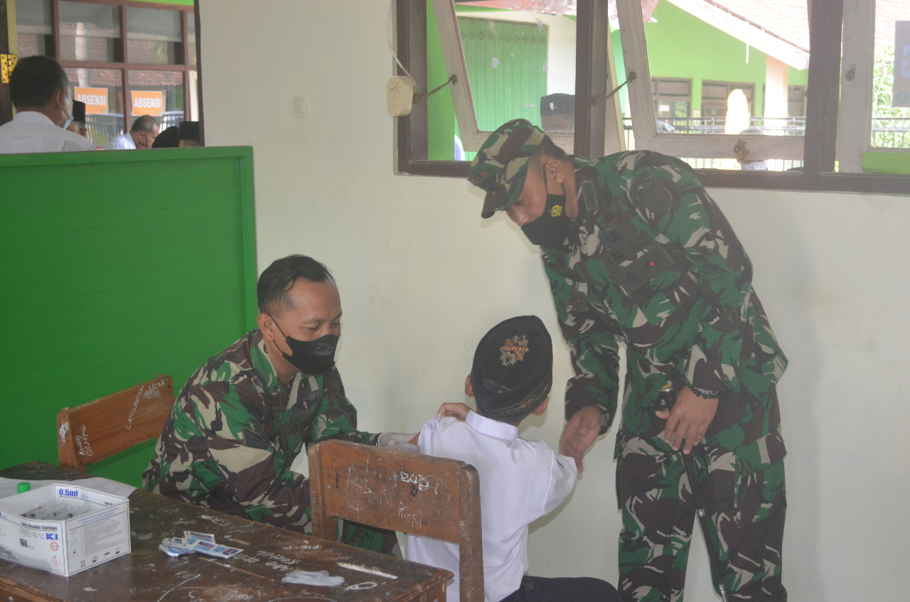 Komandan Kodim 0804/Magetan, Letkol Inf Ismulyono Tri Widodo, yang meninjau langsung pelaksanaan serbuan vaksinasi di MTsN 8 Magetan memberikan semangat kepada siswa siswi serta mengajak untuk tetap disiplin Prokes.