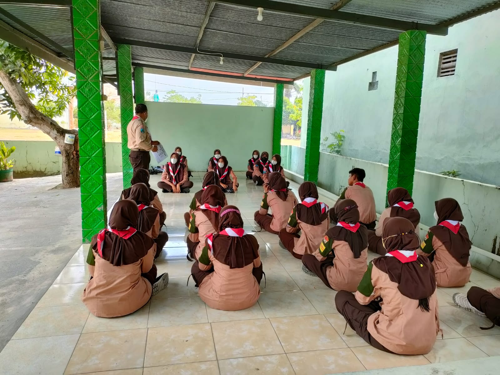 MAGETAN. Anggota Pramuka Saka Wira Kartika Pangkalan Koramil Tipe B 0804/08 Barat melaksanakan pembinaan dan latihan rutin yang di sampaikan langsung oleh Pamong Saka Wira Kartika Pelda Suroto anggota Ramil Tipe B 0804/08 Barat, Kodim 0804/ Magetan, Sabtu (16/10/2021).