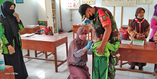Magetan – Babinsa Koramil Tipe B 0804/12 Lembeyan, Kodim 0804 Magetan Sertu Sumadi melaksanakan Pendampingan kegiatan Bulan Imunisasi Anak Sekolah (BIAS) di Sekolah Dasar Negeri 1,2,3, MI di desa Kediren, Kecamatan Lembeyan Kabupaten Magetan. Rabu (1/12/2021).