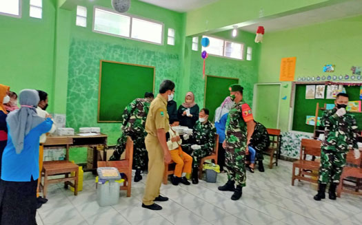 Anggota TNI bersinergi dengan POLRI memantau langsung pelaksanaan vaksinasi Covid-19 yang dilaksanakan oleh Tenaga kesehatan Poskes 05.09.07 Magetan dan Kodim 0804 Magetan kepada para siswa yang sudah terdaftar sebagai penerima vaksin.