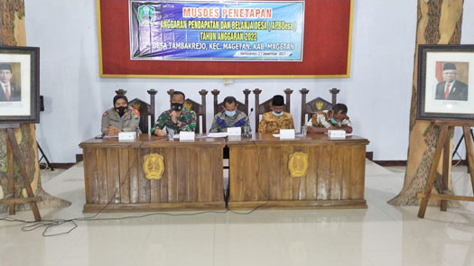 Magetan – Komandan Koramil Tipe B 0804/01 Magetan, Kodim Magetan Kapten Caj Jemani menghadiri kegiatan musyawah desa penetapan Anggaran Pendapatan dan Belanja Desa (APBdes) Tahun Anggaran 2022 di balai desa Tambakrejo Kecamatan Magetan Kabupaten Magetan.Senin (27/12/2021) malam.