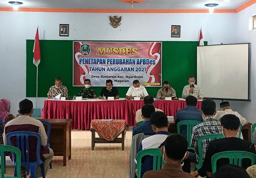 Magetan – Komandan Koramil Tipe B 0804/01 Magetan Kodim 0804 Magetan diwakili Danposramil Ngariboyo Peltu Hadi Kusnomo menghadiri pelaksanaan kegiatan Musdes Penetapan Perubahan APBDes tahun anggaran 2021 di Balai Desa Banjarejo Kecamatan Ngariboyo Kabupaten Magetan. Senin (20/12/2021)