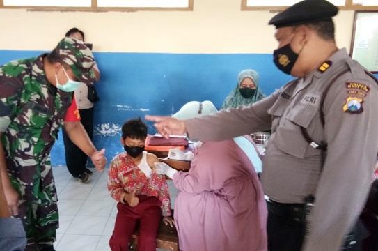 Magetan. Babinsa kelurahan Kepolorejo Koramil Tipe B 0804/01 Magetan Kodim 0804 Magetan Serma Andyk mengamankan pelaksanaan kegiatan penyuntikan Vaksin Covid – 19 dengan jenis vaksin Sinovac dosis 2 kepada anak usia 6 – 11 tahun bertempat di SDN 1 kelurahan Kepolorejo kecamatan Magetan kabupaten Magetan. Rabu (26/01/2022)