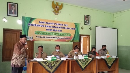 Berikutnya Ketua Gapoktan Mulyo Makmur memaparkan Rapat Anggaran Tahun (RAT) Pegembangan Usaha Agribisnis Pedesaan (PUAP) Tahun Buku 2021, meliputi organisasi, administrasi, keuangan dan kegiatan usaha selama Tahun Anggaran 2021. Di akhir paparannya, Ketua Gapoktan menyampaikan, melalui RAT PUAP ini diharapkan adanya penilaian, tanggapan, kritik dan saran dari para Poktan, Pembina dan Tim Teknis sebagai bahan masukan bagi pengurus dalam membangun Gapoktan menuju lebih baik.