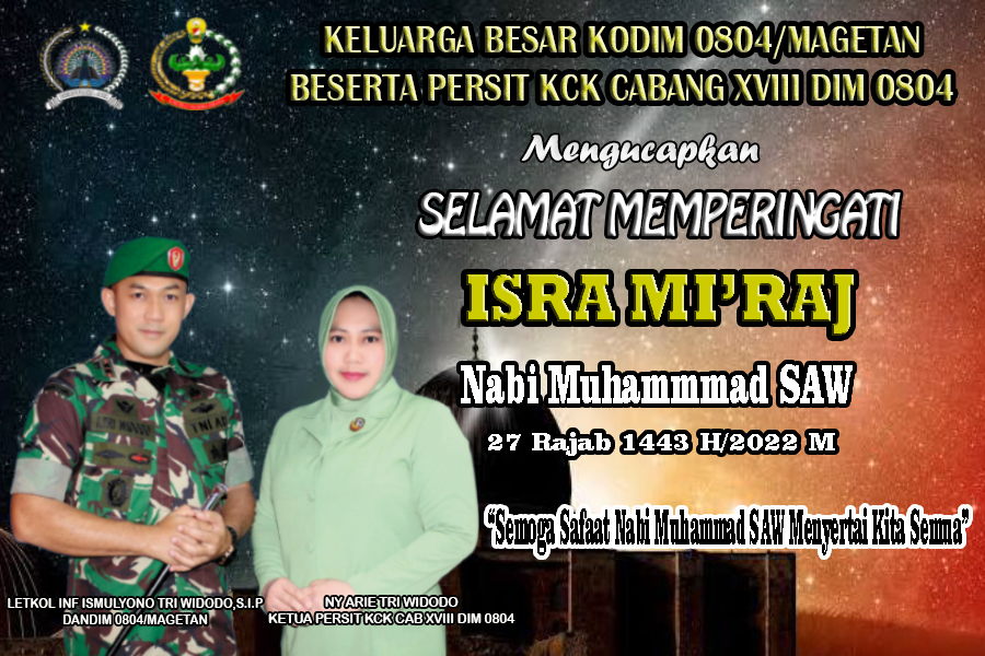 Keluarga Besar Kodim 0804/Magetan Beserta Persit KCK Cabang XVIII Dim 0804 Mengucapkan Selamat Memperingati “Isra Mi’raj Nabi Muhammad SAW” 27 Raja 1443 H/2022 M