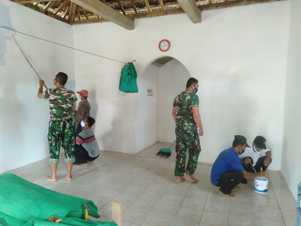 Magetan. Musholla Al Ikhlas yang dibangun di Desa Plangkrongan Kec Poncol, Kab. Magetan, sedang dilakukan kerja bakti perbaikan oleh pengurus, babinsa, dan masyarakat desa setempat, Senin (7/02/2022).