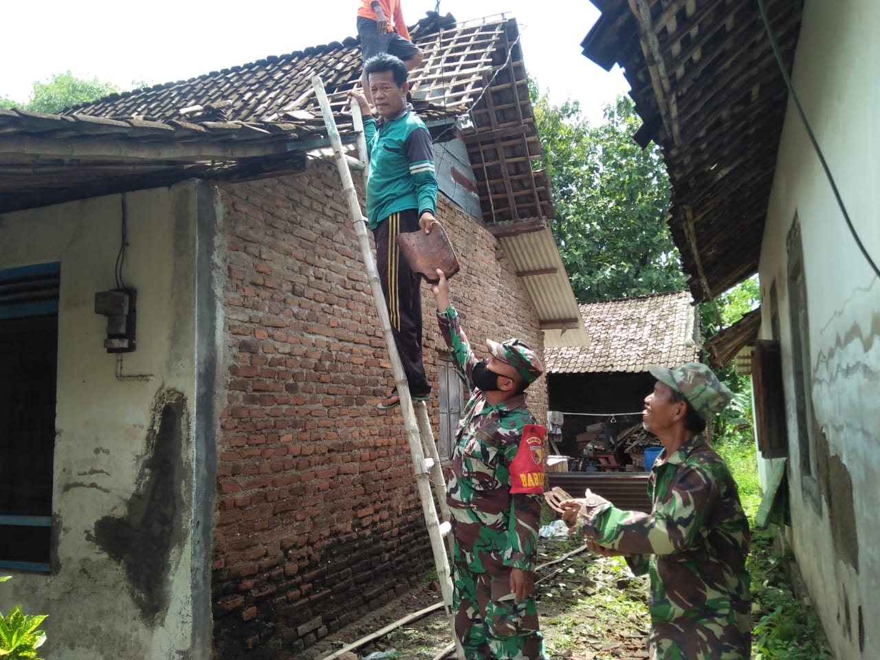 Babinsa ikut terlibat membantu warga di desa binaannya yang sedang memperbaiki atap rumahnya yang sudah begitu tua dan rapuh, sehingga sangat berbahaya untuk ditempati.