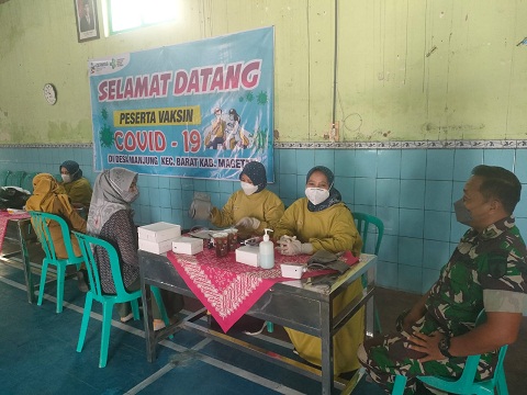Magetan. Dalam rangka mensukseskan program vaksinasi Tahap 3 Boster guna percepatan Herd Immunity, Babinsa Koramil Tipe B 0804/08 Barat Kodim 0804/Magetan Pelda Suroto bersama Bhabinkamtibmas dan Nakes Puskesmas Tebon menggelar Serbuan Vaksin Covid-19 Tahap 3 jenis Booster yang bertempat di balai Desa Manjung, Kec. Barat, Kab. Magetan. Senin (21/03/2022)